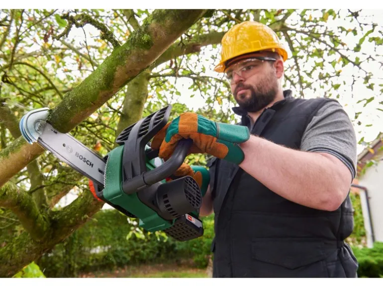 Die Kette ist aus Chrom gefertigt. Das Material ist rostfrei und verspricht eine lange Haltbarkeit. Die Kettensäge verfügt über eine automatische Kettenschmierung und ist somit besonders pflegeleicht. An der Spitze des 20 cm langen Schwertes ist eine Schutzvorrichtung verbaut, die die Kette vor Beschädigungen schützt und die Vibrationen der Säge minimiert. So lässt sich die Kettensäge einfach und sicher führen und es gelingen saubere Schnitte. Des Weiteren ist die Kettensäge mit einem stabilisierenden Führungsschutz mit Stahlkrallen ausgestattet, der für einen sauberen Unterschnitt sorgt und den Astschaden minimal hält. Das Bosch SDS-System sorgt für ein einfaches Wechseln und Spannen der Kette, ganz ohne Werkzeug.
