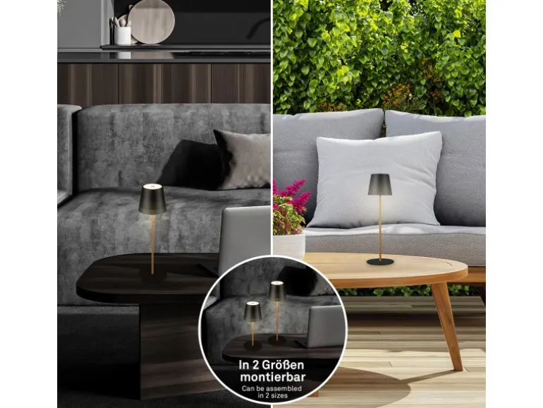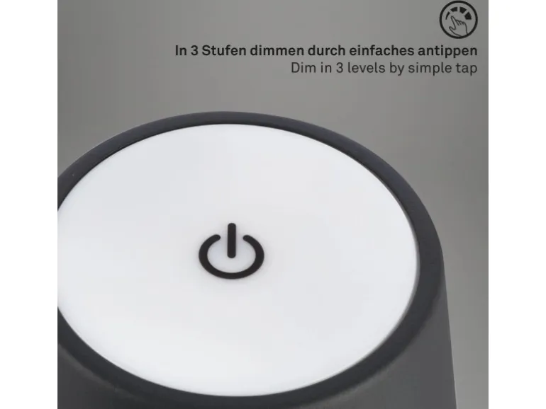 Die Stange der LED Tischlampe ist zweiteilig und kann durch eine einfache Drehbewegung getrennt werden. Legen Sie die untere Stange beiseite und drehen Sie die obere Stange mit Lampenschirm einfach auf den Sockel. Schon haben Sie eine kompakte Akkulampe. Sie kann durch Berührung in drei Stufen gedimmt werden. Das warmweiße Licht, mit einer Temperatur von 3000 Kelvin, ist ein schöner Akzent bei romantischen und gemütlichen Abenden beim Grillen mit Freunden oder einem Dinner zu zweit.