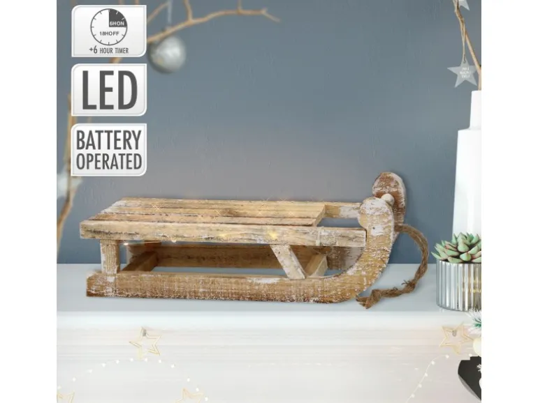 Auf Schlitten kann man nicht nur Rodeln, sondern eignen sich in der Weihnachtszeit auch als wunderschönes Dekoelement. Dieser schöne Weihnachtsschlitten ist die perfekte Ergänzung für die Weihnachtszeit. Der 31,5 cm lange Schlitten ist mit einer LED Lichterkette ausgestattet, das heißt er strahlt in warmweiß die Weihnachtsstimmung aus, die du brauchst. Verziert wird der Schlitten mit einer Schnur und präpariertem Holz. Diese Akzente unterstützen nochmals die LED Lichterkette für noch mehr Weihnachtsstimmung in deinem Zuhause.