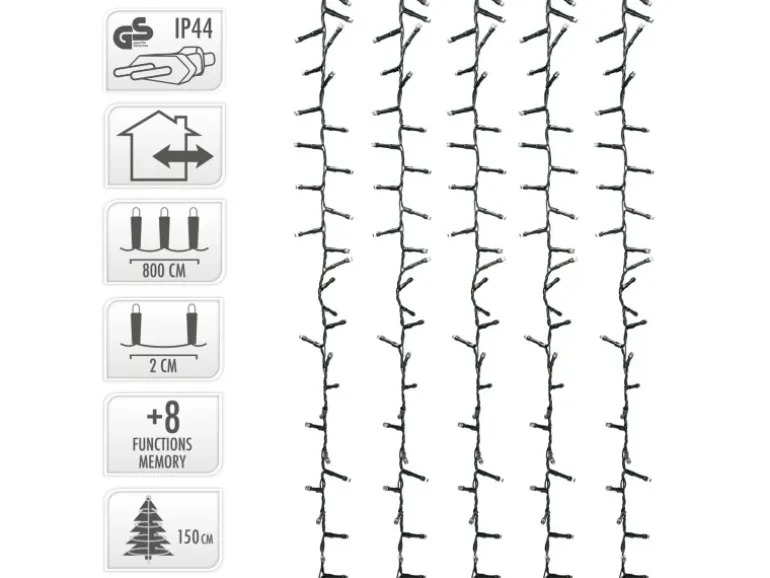 Das Highlight an der Cluster Beleuchtung sind die büschelartig angeordneten LEDs. Die Lichterkette erzeugt dadurch ein besonders schönen und einzigartigen Lichteffekt. Die Verteilung der LEDs sind jeweils links und rechts angeordnet und bekommt dadurch eine tolle Optik. Die Cluster-Lichterkette hat 8 verschiedene Funktionen. So bringen Sie viel Abwechslung rein.