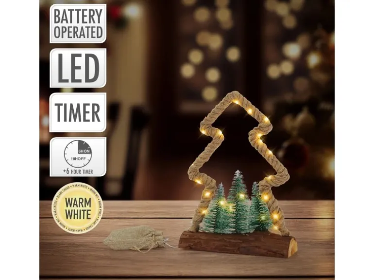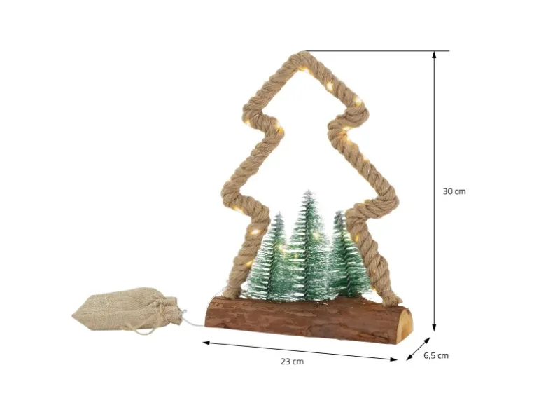 Hol dir eine stimmungsvolle Weihnachtsatmosphäre in dein Zuhause mit diesem charmanten Deko-Jutebaum. Die 30 warmweißen LEDs, die in das Juteseil eingearbeitet sind, lassen den Baum sanft leuchten und schaffen eine festliche Stimmung. Mit einer Höhe von 30 cm ist dieser Deko-Baum ein echter Hingucker, der sich ideal als Tisch- oder Fensterdekoration eignet. Die praktische 6-Stunden-Timerfunktion sorgt dafür, dass der Baum jeden Tag zur gleichen Zeit erstrahlt und sich automatisch ausschaltet. Der Batteriekasten verschwindet stilvoll in einem kleinen Jutesäckchen – eine perfekte Ergänzung für jede weihnachtliche Dekoration.