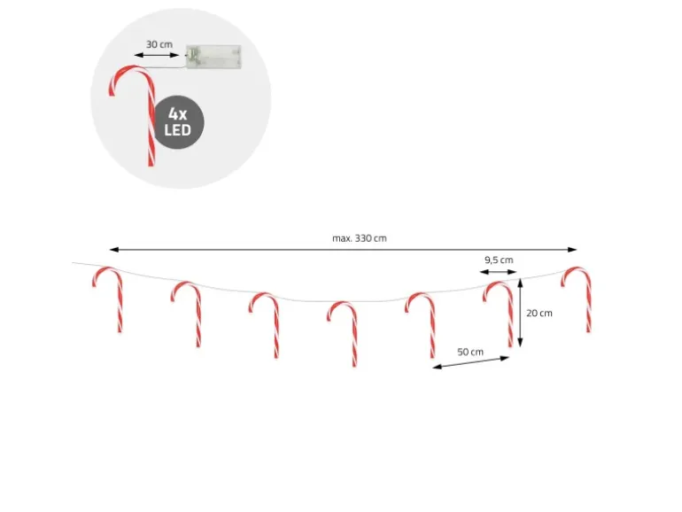 Jede Zuckerstange hat 4 warmweiße LED-Lichter, insgesamt 28 Stück, die in Ihrem Zuhause einen natürlichen, festlichen Glanz verleihen. Jede der 7 einzelnen Zuckerstangen-Lichter misst 20 cm x 9,5 cm. Zwischen jeder Zuckerstange befindet sich 50 cm.