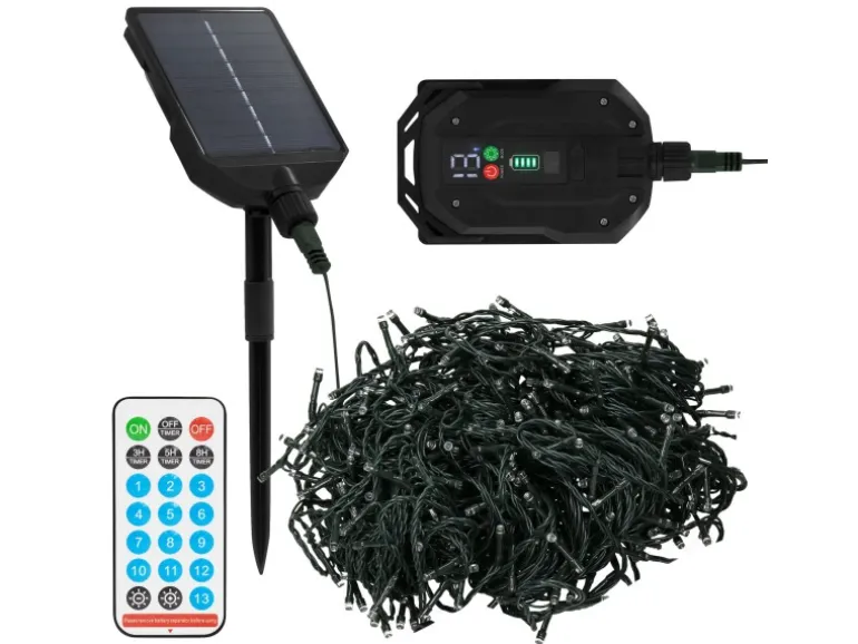 Die solarbetriebene Lichterkette mit 560 warmweißen LEDs sorgt für stimmungsvolles Licht im Innen- und Außenbereich. Dank Solarpanel und integriertem Akku ist sie unabhängig von einer festen Stromquelle und leuchtet bei zunehmender Dunkelheit automatisch auf. Über die mitgelieferte Fernbedienung kannst du aus 13 verschiedenen Leuchtfunktionen wählen, die Helligkeit in 3 Stufen dimmen sowie praktische Timerfunktionen einstellen (3h, 5h oder 8h Leuchtdauer). Die Memory-Funktion speichert den zuletzt gewählten Modus und spielt ihn nach dem erneuten Einschalten automatisch wieder ab. Zusätzlich lässt sich der Akku bei Bedarf auch über das mitgelieferte USB-Kabel aufladen – ideal für Tage mit wenig Sonnenlicht.