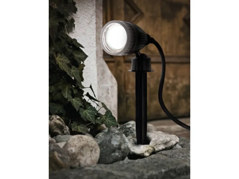 Der LED Gartenstrahler Nema 1 besteht aus einem runden, beweglichen Leuchtenkopf aus schwarzem Kunststoff und wird mit Hilfe eines Spießes in der Erde befestigt. Das mitgelieferte LED GU10-Leuchtmittel hinter der transparenten Kunststoff-Abdeckung spendet angenehmes, warmweißes Licht. Der Erdspieß lässt sich ideal zur indirekten Beleuchtung im Garten verwenden. Gleichzeitig bietet er die Möglichkeit einzelne Lichtakzente zu setzen, zum Beispiel durch die punktuelle Beleuchtung von Mauern, Gräsern, Pflanzen und Wegen. Die Außenlampe wird über einen Stecker am Kabel angeschlossen und ermöglicht dank des Spritzwasserschutzes (IP44) einen bedenkenlosen Einsatz im Außenbereich.