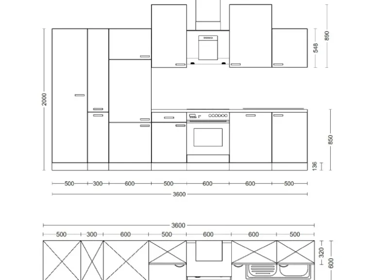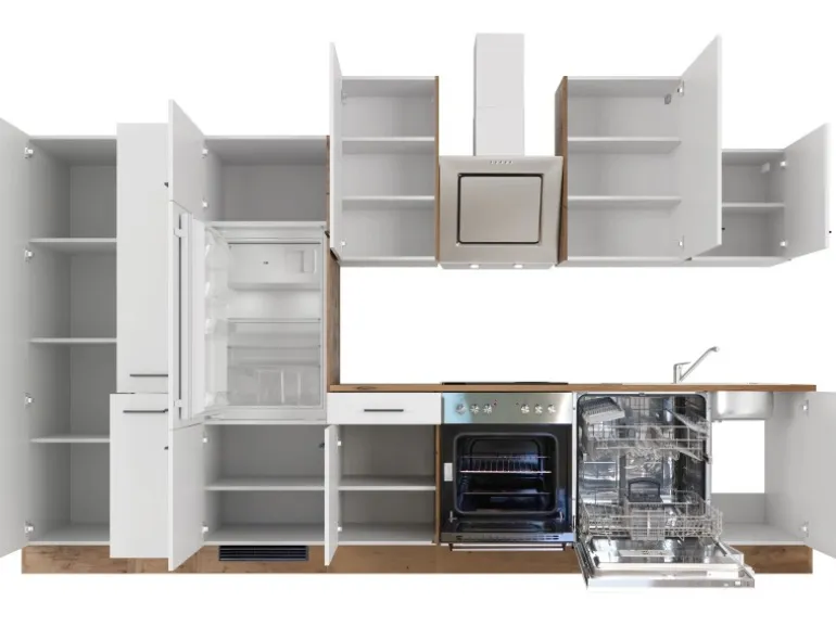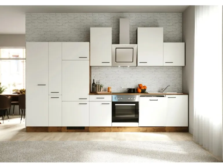 Die 310 cm breite Küchenzeile besteht aus (BxHxT):