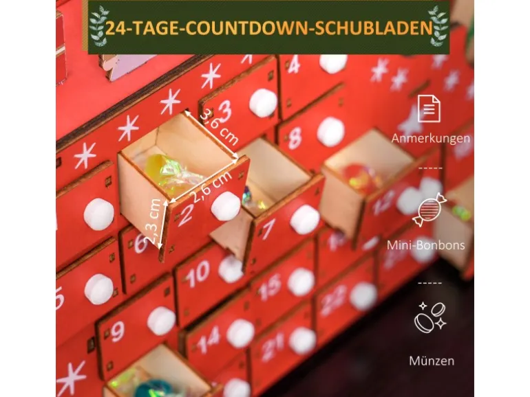 ● 24 Schubladen der Weihnachtskalender für tägliche Überraschungen und Leckereien