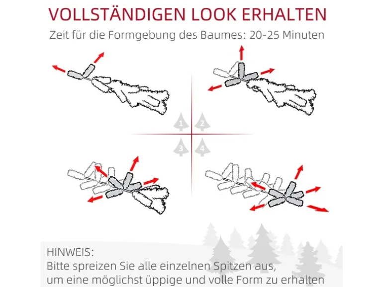 ● Hinweis: Nur für den Innenbereich, nicht für den Außenbereich geeignet. Für ein realistischeres Aussehen, alle Zweige einzeln ausbreiten, dies dauert 20 bis 25 Minuten. Die Dekorationen sind nicht enthalten.