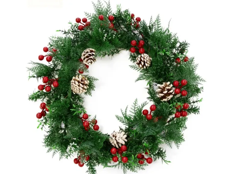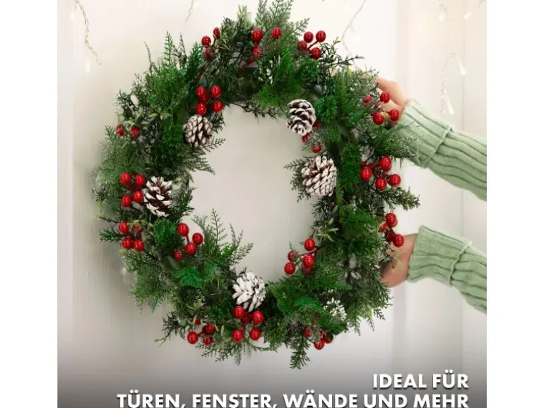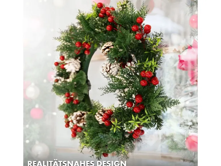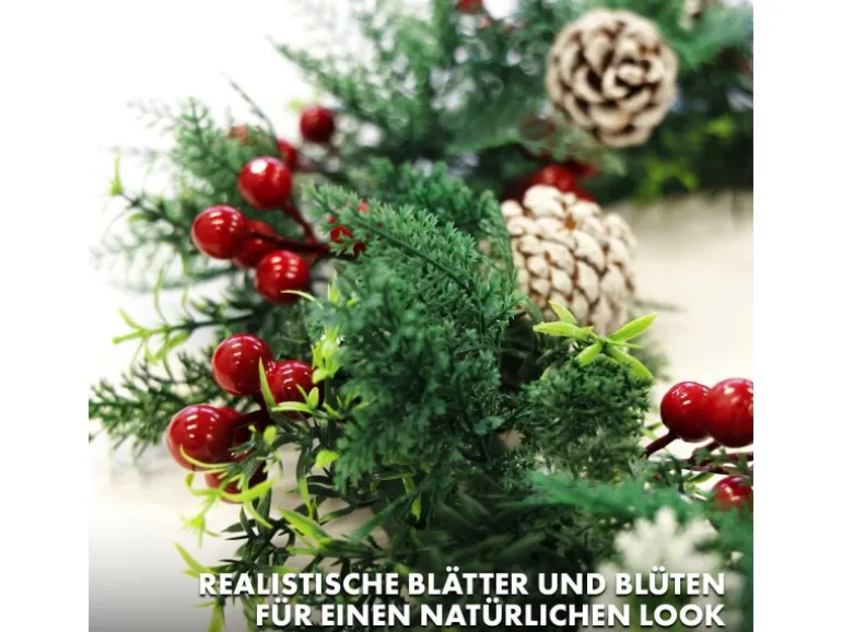 Design: Dekorativer Kranz mit roten Beeren, Tannenzapfen mit Kunstschnee und realistischen Blättern