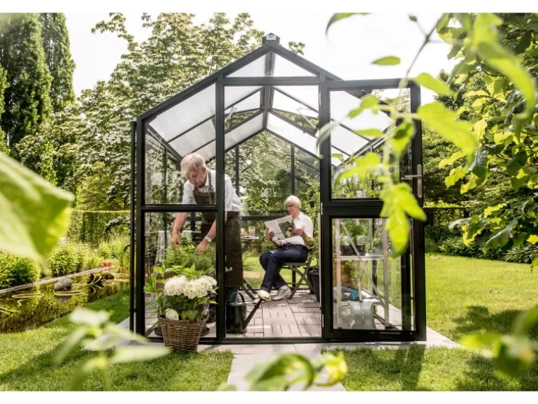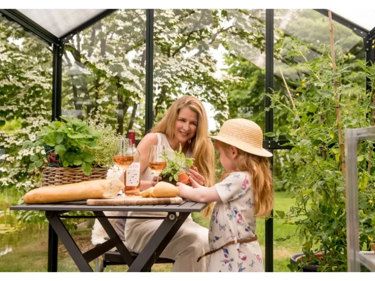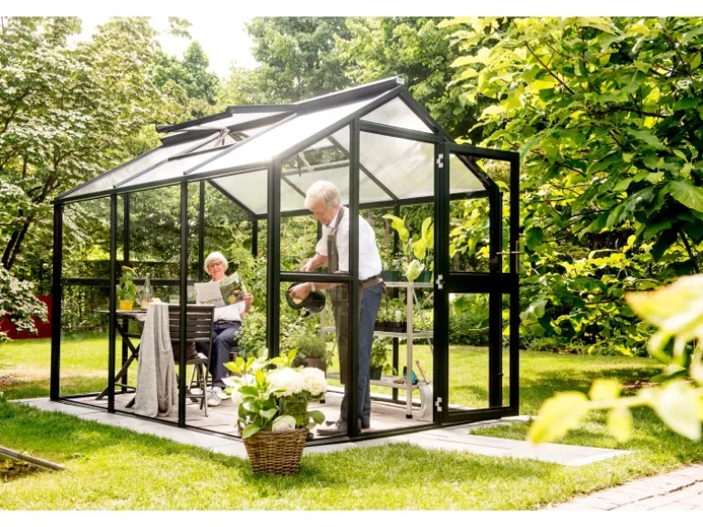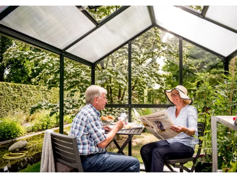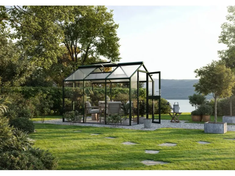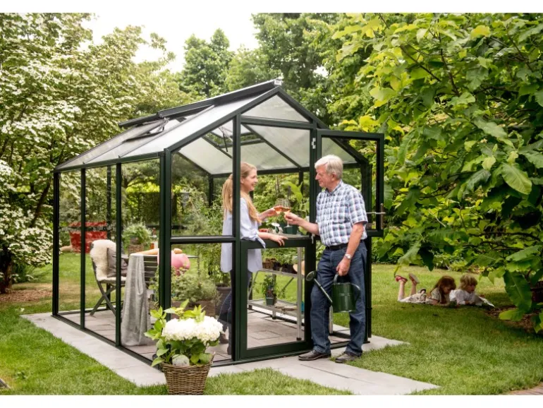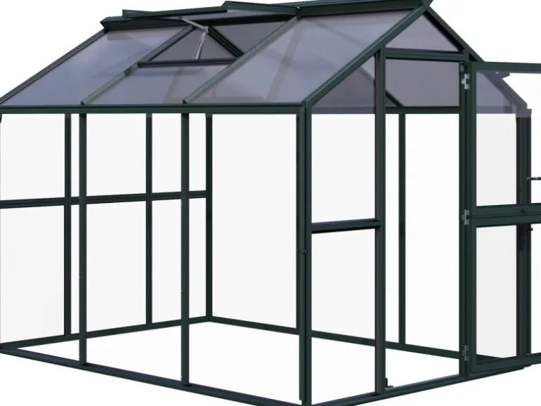 Die 10 mm starken UV-beständigen Hohlkammerplatten bieten eine hervorragende Isolierung, die das Gewächshaus im Winter warm hält und im Sommer vor Überhitzung schützt. Zudem sind sie leicht und einfach zu installieren, bruchsicher und lichtdurchlässig, was für das Pflanzenwachstum entscheidend ist. Das Satteldach bietet eine klassische und zeitlose Optik sowie gute Belüftungs- und Entwässerungseigenschaften. Die 2 Regenrinnen sorgen zudem für einen guten Ablauf des Regenwassers.