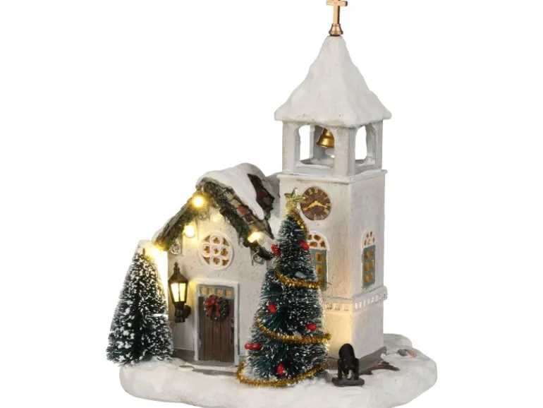 Diese Kirche aus der Luville-Sammlung ist einem schwedischen Vorbild nachempfunden. Sehr schön für Ihr Miniatur-Weihnachtsdorf! Die Kirche fällt durch ihre weiße Farbe auf und ist wunderschön mit dekorativen Fenstern und goldenen Details ausgestattet. Die Kirche ist wunderschön beleuchtet durch eine Laterne, warmweiße Lichter entlang des Daches und einen Scheinwerfer, der den Turm genau richtig trifft. Vor der Tür steht ein geschmückter Weihnachtsbaum. Die Miniatur läuft mit 3 AA-Batterien, kann aber auch an einen separat erhältlichen Adapter angeschlossen werden. Die Abmessungen sind L14 x B15 x H2 cm.