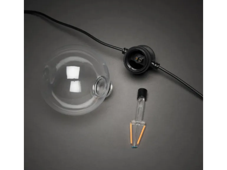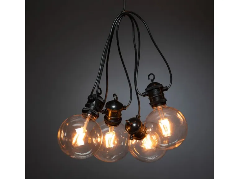 Die Lichterkette wird mit einem 24 V Außen-Trafo betrieben, der für den Einsatz im Freien geeignet ist (IP44). Das schwarze Kabel der Lichterkette fügt sich unauffällig in die Umgebung ein und lässt die Globes umso mehr herausstechen.