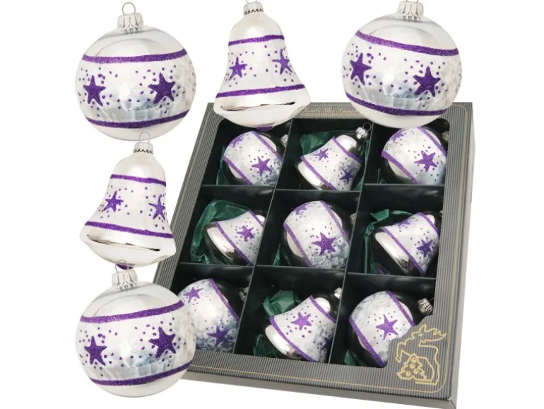 Das Glaskugelset Flieder und Sterne ist ein wunderschöner Christbaumschmuck, der aus echtem Glas handgefertigt wurde. Jede Kugel und Glocke ist 8cm bzw. 10cm groß und in einem eleganten Silber Glanz/Eisweiß gehalten. Das Set umfasst insgesamt 9 Teile, die mit einem funkelnden Violett Glitter-Dekor verziert sind. Diese mundgeblasenen und handdekorierten Ornamente werden deinen Weihnachtsbaum in ein strahlendes Fest verwandeln. Hol dir jetzt dieses exklusive Sortiment und verleihe deinem Baum einen Hauch von Eleganz!
