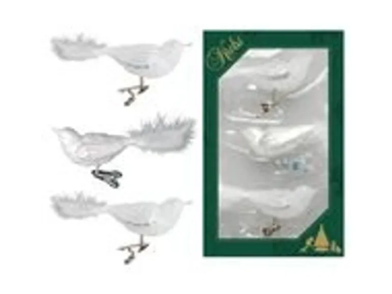 Begeistert von der Vielfalt wie von der lebensnahen Gestaltung der in Handarbeit gefertigten Vögel aus Glas, überzeugen ihre Nachbildungen bis ins Detail.Maße: ca. 11 cm mit 6 cm Federschwanz Material: Glas (mundgeblasen und handgemalt) Farbe: weiß Verpackungsinhalt: 3 Stück in einer Box