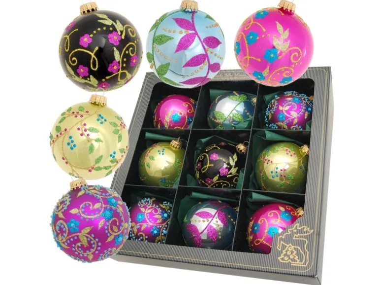 Das Glaskugelsortiment Enchanted Forest ist eine exklusive Sammlung von 9 mundgeblasenen und handdekorierten Glaskugeln. Jede Kugel ist 8cm groß und verfügt über ein einzigartiges florales Dekor mit Glitter. Diese hochwertigen Baumschmuckstücke sind aus echtem Glas gefertigt und sorgen für eine zauberhafte Atmosphäre in Ihrem Zuhause. Ein Must-Have für jeden Liebhaber von kunstvollen Weihnachtsdekorationen.