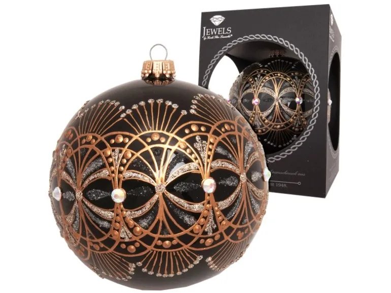 Die mundgeblasene und handbemalte edle Baumkugel aus der Jewels by Krebs Glas Lauscha Kollektion ist ein Juwel für deinen Christbaum in edler Geschenkbox. Die Jugendstilkugel in Schwarz Glanz mit Strasssteinen und einem Durchmesser von 10cm verleiht deinem Baum eine edle Note. Jedes Stück ist ein Unikat und sorgt für strahlende Weihnachtsstimmung. Gönn dir dieses hochwertige Baumschmuckstück aus echtem Glas und mach deinen Weihnachtsbaum zum Blickfang!