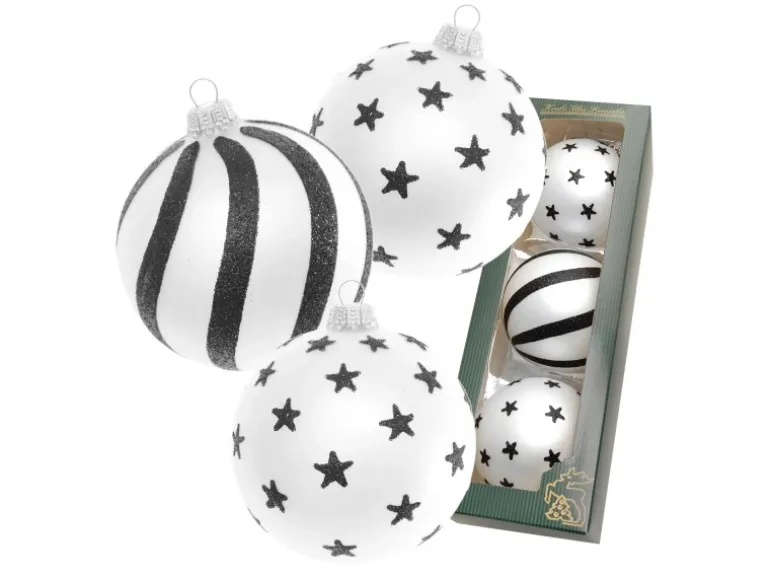 Erlebe Weihnachten in elegantem Schwarz und edlem Weiß mit unserem Baumkugelset Xmas Black & White Satin! Die mundgeblasenen gläsernen Kugeln sind handdekoriert und mit stilvollen Wirbeln und Sternen in Schwarz Glitter verziert. Mit einer Größe von 8cm sind sie perfekt für jeden Christbaum und verleihen ihm einen Hauch von Luxus. Unser Baumkugelset besteht aus drei Kugeln in mattem Weiß und ist mit einem Dekor aus Wirbeln und Sternen in Schwarz Glitter versehen. Jede Kugel ist aus echtem Glas mundgeblasen und von Hand dekoriert, was für eine besonders hochwertige Qualität sorgt. Mit einer Größe von 8cm passen sie perfekt an jeden Weihnachtsbaum und lassen ihn in elegantem Schwarz und edlem Weiß erstrahlen. Unser Baumkugelset Xmas Black & White Satin ist nicht nur ein Schmuckstück für jeden Weihnachtsbaum, sondern auch ein tolles Geschenk für Familie und Freunde. Die hochwertige Qualität und das stilvolle Design machen es zu einem besonderen Hingucker in jedem Zuhause.