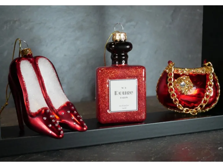 Christbaumschkuck Ornamente aus Glas Set Lady in Red – High Heels 9cm, Handtasche 6cm, Parfümflasche 9cm