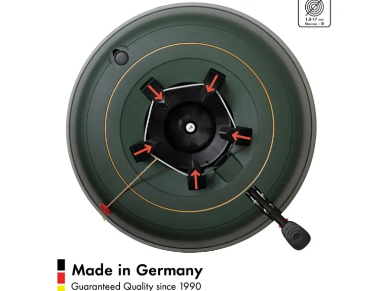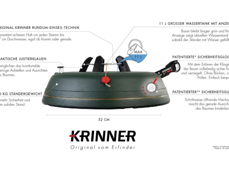 Die durchgehende Seilführung der original Rundum-Einseil-Technik garantiert dabei den gleichmäßigen Druck der Klauen an den Stamm. Einfach den Baum in den Ständer stellen, das Fußpedal treten, und schon ist der Baum aufgestellt. Ob dick, dünn oder krumm gewachsen, der Baum steht immer sicher und kerzengerade. Die patentierte Sicherungsglocke im Fußpedal signalisiert gut hörbar, wenn die Klauen sicher und fest am Baum anliegen und der Verschluss des Fußhebels automatisch eingerastet ist.