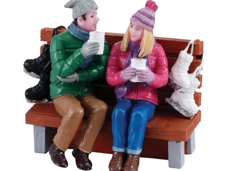 Die Lemax Weihnachtsdekoration Eisläufer trinken heiße Schokolade zeigt einen Junge und ein Mädchen gemütlich auf einer Bank sitzend. Nach dem Eislaufen genießen sie heiße Schokolade.
