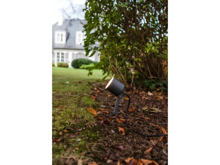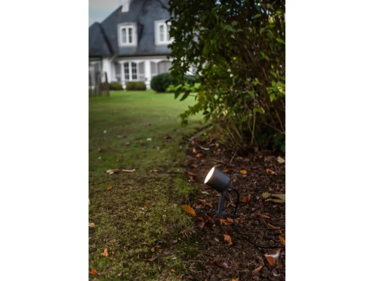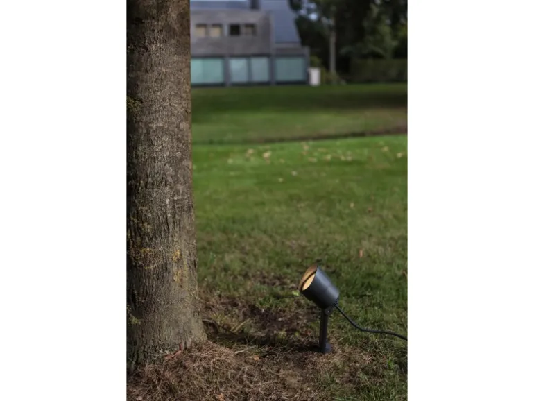 Eleganter und kompakter Strahler auf einem Erdspieß, horizontal und vertikal verstellbar, mit einem warm weißen LEDLichtstrahl. Die separate Spot-Cap kann verwendet werden um den Lichtstrahl so auszurichten, dass keine Blendung entsteht. Auch erhältlich mit WiZLichtmodul für noch mehr Komfort.