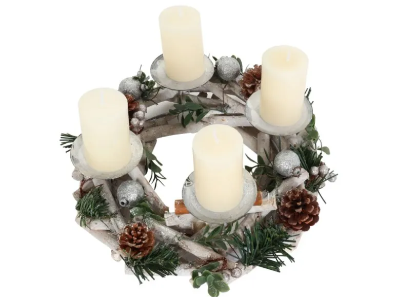 – Dieser Adventskranz mit Kerzenhaltern ist die perfekte Weihnachtsdekoration für die festliche Jahreszeit. Hergestellt aus natürlichen Materialien im Silber-Look und langlebiger Grün-Dekoration, strahlt es einen warmen, gemütlichen Charme aus.