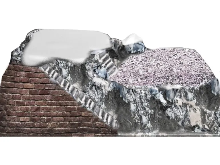 Die Berglandschaft ist in mehreren Farben und mit einem Relief bedruckt. Das Modell bietet Platz für 2 Häuser und etwas Zubehör. Der Berg hat 2 Oberflächen in unterschiedlichen Höhen.