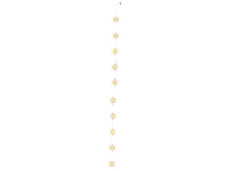 10er-LED-Lichterkette „3D-STERNE“ – und dekorieren wird zum Kinderspiel Die 10er-LED-Lichterkette „3D-STERNE“ sorgt für festliche Stimmung und eine gemütliche Atmosphäre. Mit dieser hochwertigen Lichterkette aus durchsichtigem weißem Kunststoff zaubern Sie ein strahlendes Licht und eine entspannende Atmosphäre in Ihr Zuhause. Dieser Artikel hat die Abmessungen von 165 x 10 x 10 cm. Diese Lichterkette ist mit 10 hochwertigen LEDs ausgestattet, die ein angenehmes und dekoratives Licht erzeugen. Eine Lichterkette, die sich perfekt für Dekorationen aller Art eignet. Diese Lichterkette ist mit einer Timerfunktion ausgestattet, sie geht zu einer bestimmten Zeit an und auch wieder aus und Sie müssen nicht mehr an Ausschalten denken. Mit einer Leuchtstärke von 10 Lumen und einer Farbtemperatur von 2700 Kelvin sorgt diese Lichterkette für eine angenehme Atmosphäre. Die Lichterkette wird mit Batterien betrieben, das macht sie unabhängig von Steckdosen. Dieses Produkt funktioniert mit 3 AA-Batterien. Mit dem integrierten Schiebeschalter wird die Lichterkette einfach ein- und ausgeschaltet. Dieses Produkt entspricht der Klasse 3 und der Schutzart IP44. Dank des praktischen Schiebeschalters können Sie die Lichterkette ganz leicht ein- und ausschalten. Dieses Produkt ist gemäß Klasse 3 und Schutzart IP44 ausgelegt. Die 10er-LED-Lichterkette „3D-STERNE“ sorgt für festliche Stimmung und eine gemütliche Atmosphäre. Verleihen Sie Ihrem Zuhause mit dieser hochwertigen, weißen Lichterkette aus Kunststoff eine einzigartige Atmosphäre und zaubern Sie strahlendes Licht. Dieser Artikel misst 165 x 10 x 10 cm. Diese Lichterkette ist mit 10 hochwertigen LEDs ausgestattet, die ein angenehmes und dekoratives Licht erzeugen. Eine Lichterkette, die sich perfekt für Dekorationen aller Art eignet. Diese Lichterkette ist mit einer Timerfunktion ausgestattet, sie geht zu einer bestimmten Zeit an und auch wieder aus und Sie müssen nicht mehr an Ausschalten denken. Mit einer Leuchtstärke von 10 Lumen und einer Farbtemperatur von 2700 Kelvin sorgt diese Lichterkette für eine angenehme Atmosphäre. Die Lichterkette wird mit Batterien betrieben, das macht sie unabhängig von Steckdosen. Dieses Produkt benötigt 3x das Battarieformat AA. Mit dem Schiebeschalter der Lichterkette können Sie die Kette schnell und einfach ein und aus schalten. Dieses Produkt entsprichtKlasse 3 und Schutzart IP44.