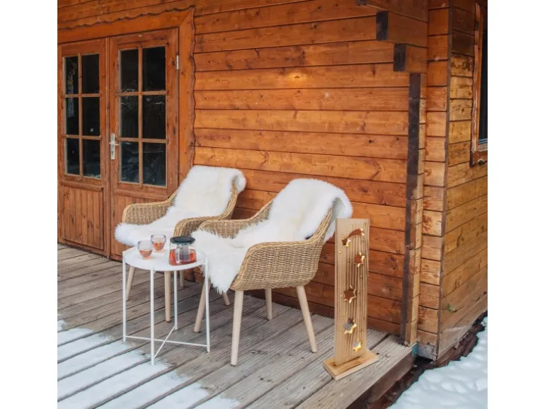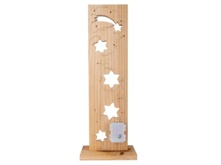 Lichterzauber für die schönste Zeit des Jahres: LED-Holz-Dekoleuchte „STERNE“ Weihnachtslichter gehören einfach zur festlichen Jahreszeit und schaffen eine unvergleichliche Atmosphäre voller Wärme und Glanz. Mit unseren beleuchteten Weihnachtsartikeln bringen Sie diese Magie direkt in Ihr Zuhause. Ob leuchtende Sterne, funkelnde Kugeln oder strahlende Figuren – jede Dekoration sorgt für ein stimmungsvolles Ambiente und macht Ihr Zuhause zu einem festlichen Blickfang. Lassen Sie sich von der Vielfalt und dem Lichterglanz inspirieren und zaubern Sie unvergessliche Weihnachtsmomente! LED-Holz-Dekoleuchte „STERNE“ im Landhaus Stil – länglich und sehr dekorativ. Diese naturfarbene Weihnachtsdekoration aus Holz verbreitet weihnachtliche Atmosphäre und eignet sich auch als perfektes Geschenk für die Adventszeit! Die Maße des Artikels belaufen sich auf 11 cm Breite, 21,5und 60 cm Höhe. Der Weihnachtsartikel ist mit 1 energieeffizienten LED-Leuchtmittel ausgestattet, was eine langlebige und energieeffiziente Beleuchtung garantiet. Mit einer Gesamtleuchtkraft von 6 Lumen und dem Kelvin-Wert von 2700 erzeugt sie eine wunderschöne Atmosphäre. Mit dem Druckschalter können Sie den Artikel schnell und einfach Ein- und Ausschalten. Der Artikel wird mit Batterien betrieben, das macht sie unabhängig von Steckdosen. Die Batterien werden nicht mitgeliefert. Dieser Weihnachtsartikel mit praktischer Timerfunktion sorgt automatisch für angenehmes Licht und schaltet sich selbstständig ein und aus – optimal für eine festliche Atmosphäre ohne Aufwand. Dieses Produkt ist gemäß Klasse 3 und Schutzart IP44 ausgelegt.