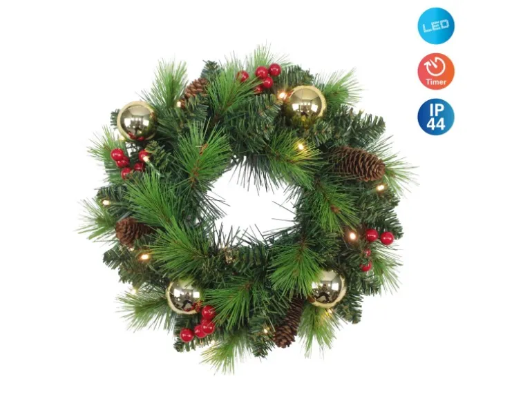 Verleihen Sie Ihrem Zuhause festlichen Glanz mit unseren beleuchteten Weihnachtsartikeln Weihnachtslichter gehören einfach zur festlichen Jahreszeit und schaffen eine unvergleichliche Atmosphäre voller Wärme und Glanz. Mit unseren beleuchteten Weihnachtsartikeln bringen Sie diese Magie direkt in Ihr Zuhause. Ob leuchtende Sterne, funkelnde Kugeln oder strahlende Figuren – jede Dekoration sorgt für ein stimmungsvolles Ambiente und macht Ihr Zuhause zu einem festlichen Blickfang. Lassen Sie sich von der Vielfalt und dem Lichterglanz inspirieren und zaubern Sie unvergessliche Weihnachtsmomente! LED-Weihnachtskranz „NOEL“ gold im Landhaus Stil – organisch und sehr dekorativ. Bringen Sie mit dieser Weihnachtsdekoration aus Metall und Kunststoff in Goldfarben im Nu weihnachtliche Atmosphäre in Ihr Zuhause. Die Maße des Artikels belaufen sich auf 35 cm Breite, 35und 8 cm Höhe. Der Weihnachtsartikel ist mit 20 energieeffizienten LED-Leuchtmittel ausgestattet, was eine langlebige und energieeffiziente Beleuchtung garantiet. Diese Leuchte ist ein perfektes Accessoire für jede Weihnachtsdekoration. Mit ihren 5 Lumen und einem Kelvin Wert von 3000 erzeugt sie weihnachtliche Stimmung. Mit dem praktischen Druckschalter lässt sich der Artikel spielend leicht ein- und ausschalten. Dank des Batteriebetriebs können Sie den Artikel überall nutzen, ohne auf eine Steckdose angewiesen zu sein. Die Batterien werden nicht mitgeliefert. Dieser Weihnachtsartikel mit praktischer Timerfunktion sorgt automatisch für attraktives Licht und schaltet sich selbstständig ein und aus – ideal für eine festliche Atmosphäre ohne Aufwand. Dieses Produkt entspricht Klasse 3 und der Schutzart IP44.