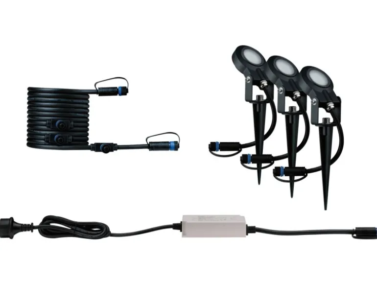 Auspacken, zusammenstecken, Garten beleuchten: das Paulmann LED-Outdoor-Spot Sting Plug & Shine Starterset 3 Stk Insektenfreundlich, bestehend aus drei Erdspießen, Trafo und Verbindungskabel bietet einen idealen Einstieg in die Außenbeleuchtung. Die Spots mit einer Lichtfarbe von 2.200 K sind besonders insektenfreundlich, denn dieser Wert liegt außerhalb des sichtbaren Bereiches für die meisten Insekten, somit werden diese nicht von der zusätzlichen Lichtquelle angezogen. Die Leuchten schützen die Insekten aktiv, ohne dabei den Nutzen für den Menschen zu vernachlässigen. Das warme Goldlicht schafft eine angenehme Stimmung rund ums Haus. Die Spieße eignen sich ideal zum Anstrahlen von Pflanzen oder Gegenständen, lassen sich individuell ausrichten und sind absolut wetterbeständig. Bei Bedarf lässt sich das System um weitere Plug & Shine Komponenten erweitern.