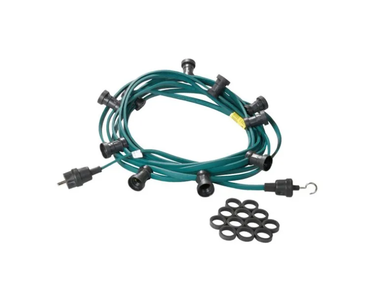 Partylichterkette: fertig konfektioniert – Fassungen, Stecker und Endstück sind bereits montiert Flachbandkabel: 2 x 1,5 mm² – Grün Flachkabelstecker aus Gummi und Endstück mit Montagehaken Zuleitung (Stecker bis erste Fassung): 1,5 Meter Nachlauf: letzte Fassung bis zum Haken: 0,5m Schutzklasse IP 44 – für Innen und Außen geeignet Montierte Fassungen E27 Schraubgewinde mit Gummi-Lampendichtung Maximale Belastung der Fassung: 40W/230V Max. 50m mit 60 Fassungen zulässig