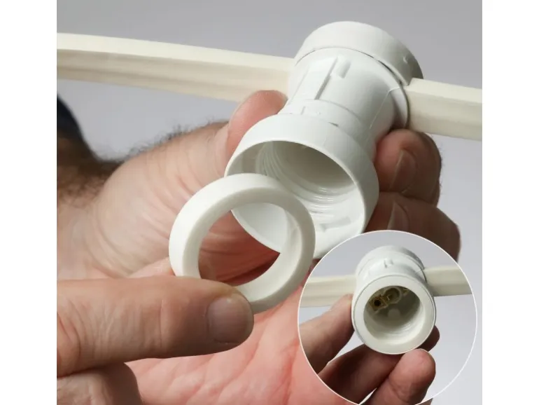Das Kabel und die Fassungen der Lichterkette vertragen dabei Regenschauer, Wind, Kälte und natürlich Sonneneinstrahlung. So kann die Lichterkette ganzjährig im Freien montiert bleiben. Ein in die Fassungen eingesetzter Gummiring presst sich zwischen Leuchtmittel und Fassung und dichtet zuverlässig und dauerhaft ab.