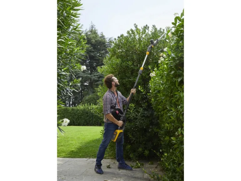 Das Stiga Akku-Multitool MT 500e wird mit einem Hochentaster- und einem Heckenscherenaufsatz geliefert. Ein weicher Gummigriff und der Kohlefaser-Schaft, der das Produktgewicht auf ein absolutes Minimum reduziert, erhöhen den Komfort und die Benutzerfreundlichkeit. Der teleskopische Schaft kann um 65 cm verlängert werden und erreicht somit eine maximale Arbeitshöhe von bis zu 4 m mit dem Entaster-Aufsatz und 4,3 m mit dem Heckenscheren-Aufsatz.