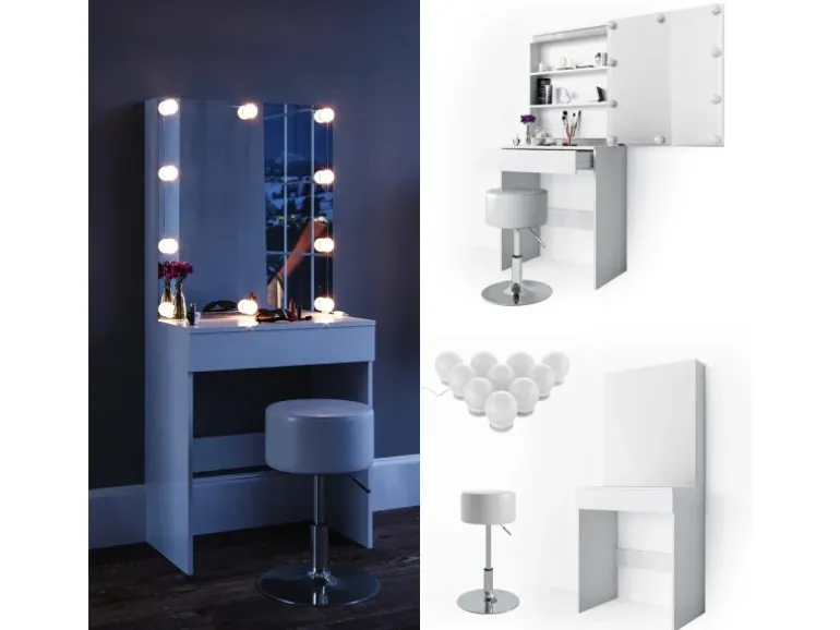 LIEFERUMFANG: Schminktisch, Hocker, LED-Lichterkette, Montageanleitung, Montagematerial