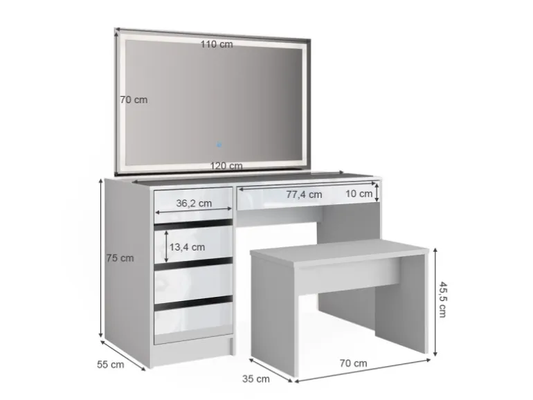 Der Schminktisch hat eine Breite von 120 cm, eine Höhe von 75 cm und eine Tiefe von 55 cm
