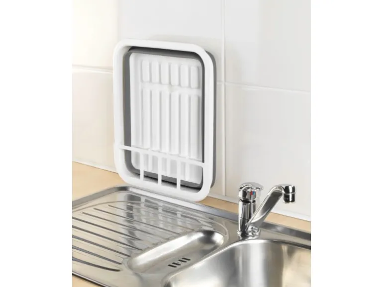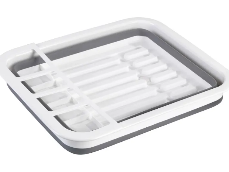 Der Abtropfer besteht aus flexiblem Silikon und bietet mit seiner großen Ablagefläche viel Platz für Geschirr, Besteck oder sonstigen Küchenutensilien. Darüber hinaus ist er rutsch- und kratzfest und verfügt über genug Stellplatz für Teller und Tassen und hat eine separate Vorrichtung für Besteck. Der ausziehbare Ablauf vereinfacht das Abgießen von Wasser und erleichtert die Reinigung. Dabei bleibt die Arbeitsplatte stets trocken.