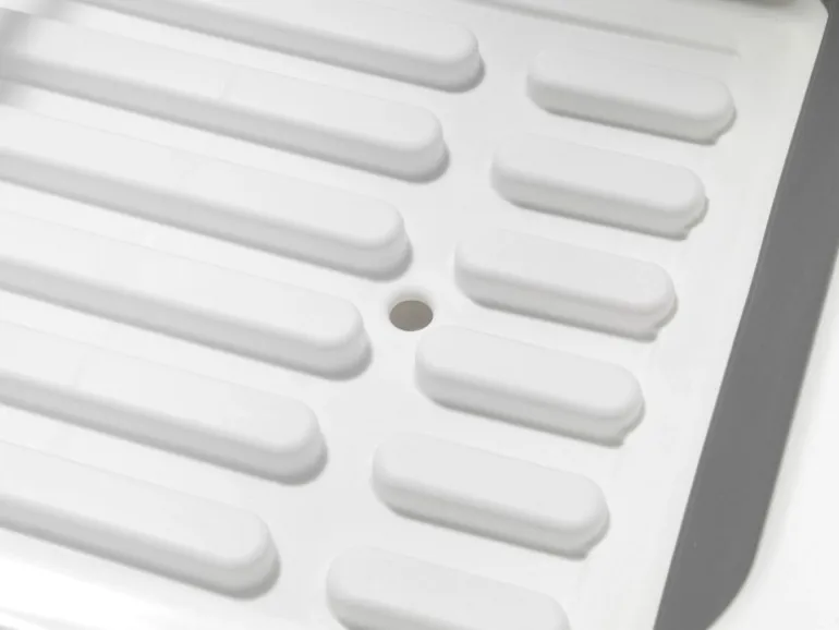 Aus flexiblem Silikon in Grau/Weiß, welches rutsch- und kratzfest ist