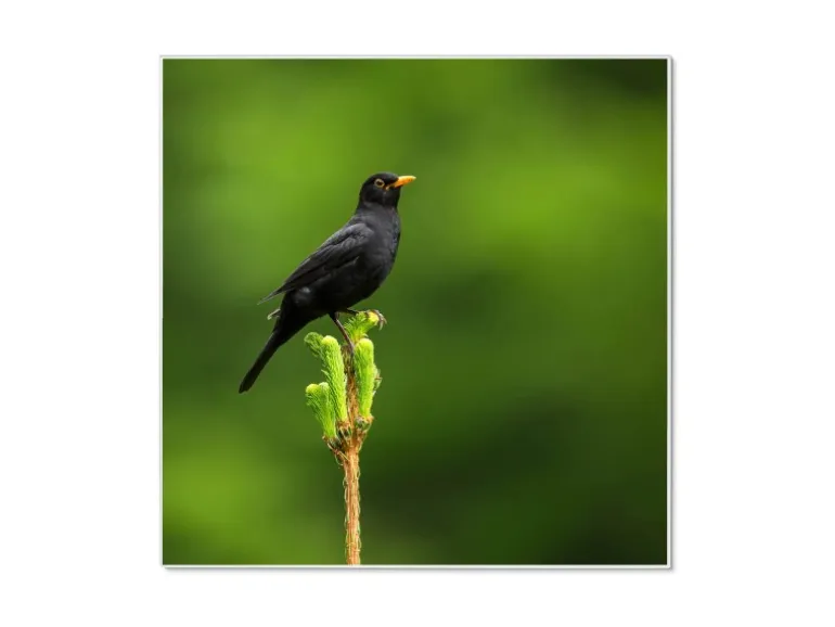 Das Motiv Vogel auf Tannenzweig wird mit einem Schutzlaminat überzogen und ist lösungsmittelfrei.