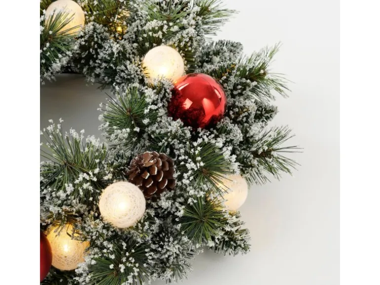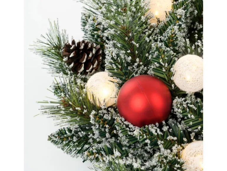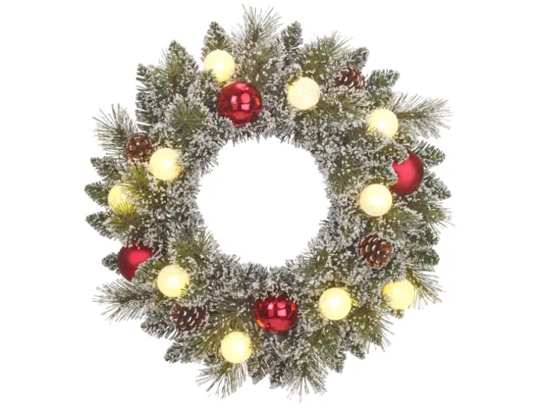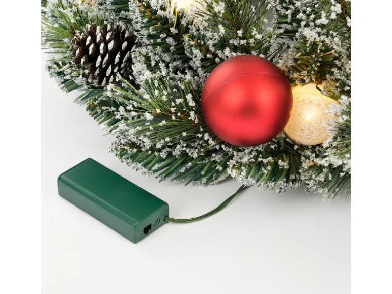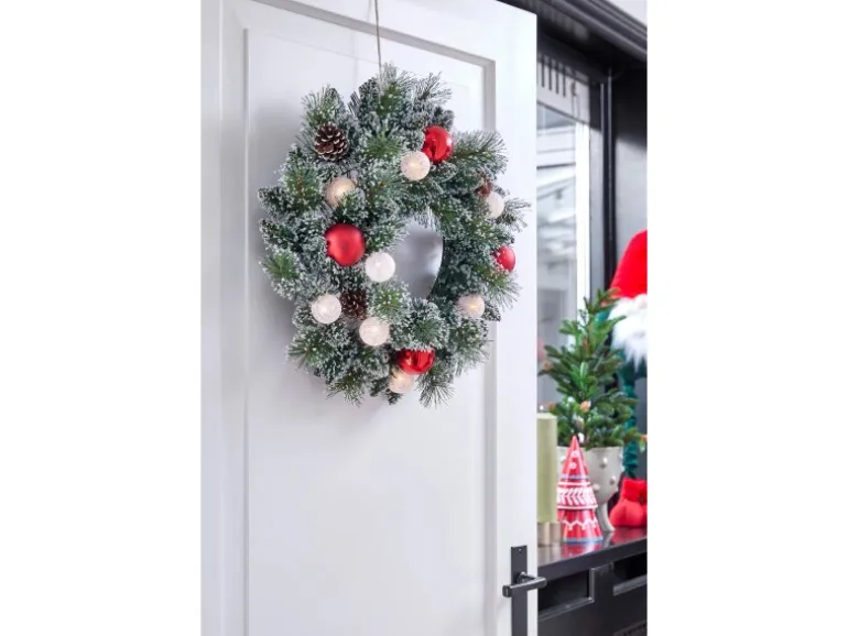 Die 10 warmweißen LEDs schaffen eine gemütliche Beleuchtung und sind dank Batteriebetrieb mit Timer-Funktion besonders praktisch. Mit einem Durchmesser von 45 cm und einer Höhe von 10 cm eignet sich dieser Kranz perfekt für Türen, Fenster oder als Tischdekoration. Batterieart AA/2 Stück (nicht enthalten).