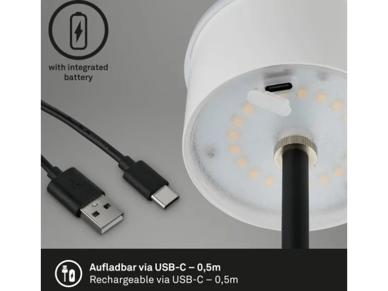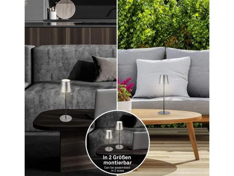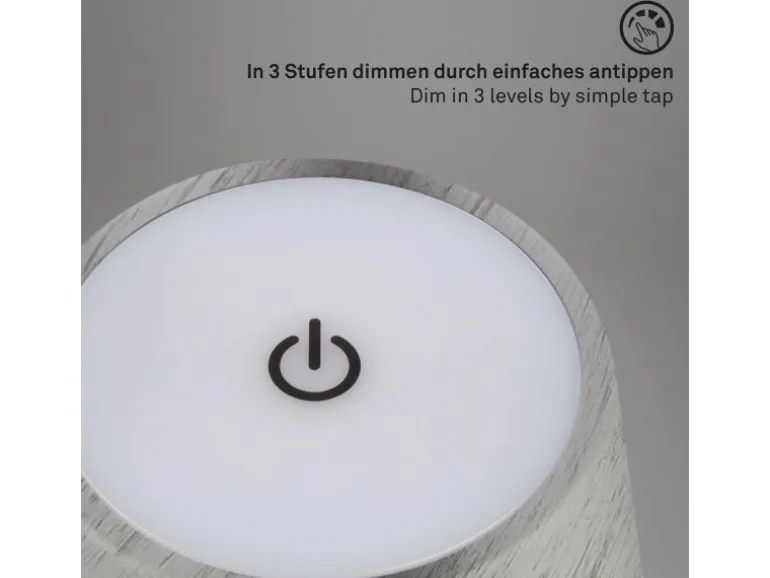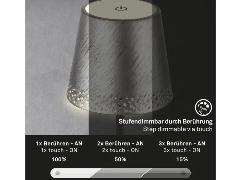 Die Stange der LED Tischlampe ist zweiteilig und kann durch eine einfache Drehbewegung getrennt werden. Legen Sie die untere Stange beiseite und drehen Sie die obere Stange mit Lampenschirm einfach auf den Sockel. Schon haben Sie eine kompakte Akkulampe. Sie kann durch Berührung in drei Stufen gedimmt werden. Das warmweiße Licht, mit einer Temperatur von 3000 Kelvin, ist ein schöner Akzent bei romantischen und gemütlichen Abenden beim Grillen mit Freunden oder einem Dinner zu zweit.