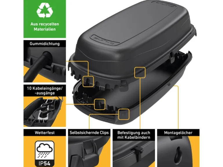 Die Wetterschutzbox ist auf beiden kurzen Seiten mit je 5 Kabeleingängen / Kabelausgängen inkl. schützender Gummidichtungen ausgerüstet. Weitere Ausstattungsmerkmale sind Montagelöcher und selbstsichernde Clips. Die Box kann alternativ auch mit Kabelbindern verschlossen werden.