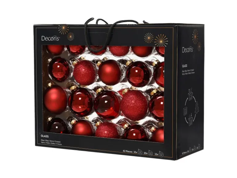 Die Kugeln bestehen aus hochwertigem Glas und kommen in einer edlen Mischung aus glänzender, matter, glitzernder und transparenter Oberfläche. Jede Kugel ist mit einer eleganten goldfarbenen Metallkappe versehen, die einen luxuriösen Akzent setzt.