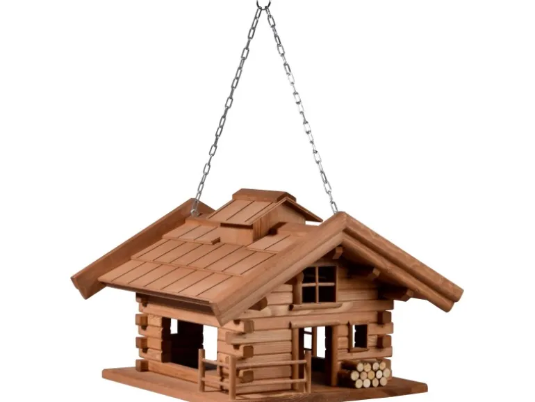 Das Vogelfutterhaus „Appenzell“ besticht durch ein detailreiches Äußeres und ist ein bewährter Klassiker wenn es um die Vogelfütterung geht. Das Design ist einer rustikalen Berghütte nachempfunden, wie sie auf den Almwiesen in den Alpen häufig zu finden ist. Das hölzerne Futtersilo im Inneren kann durch die abnehmbare Dachspitze befüllt werden und schützt das Vogelfutter zuverlässig vor Regen und Verschmutzung. Auf dem Futtertablett können zudem allerlei Leckereien ausgelegt werden, um viele einheimische Wildvögel in Ihren Garten zu locken. Mit der Metallkette kann das Vogelhaus überall auf der Terrase und im Garten aufgehängt werden. Die massive Futterstelle besteht aus FSC-zertifiziertem Kiefernholz (Pinus sylvestris, Hauptholzart) aus nachhaltigerer Forstwirtschaft und ist wetterfest lasiert. Die Herstellung in europäischer Produktion erfolgt in Handarbeit mit Fokus auf bester Qualität in der Verarbeitung. Die Außenmaße der Vogelfutterstation sind ca. 37 x 37 x 26 cm (L x B x H).