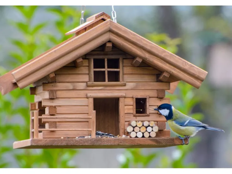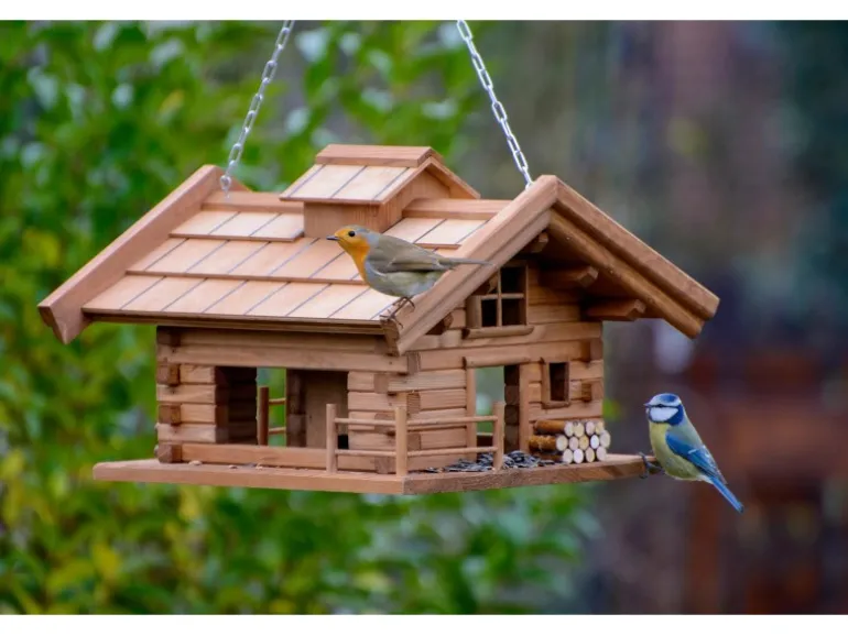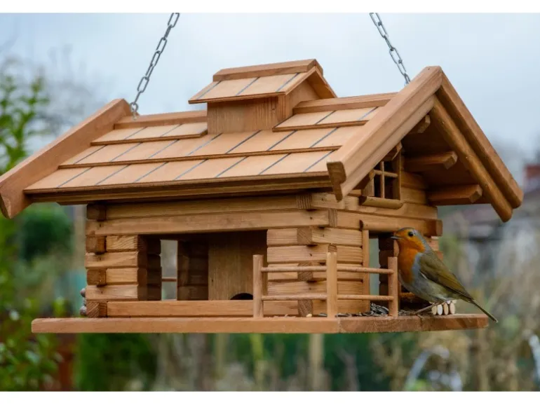 Das Vogelhaus besteht aus FSC-zertifiziertem Kiefernholz und ist wetterfest lasiert