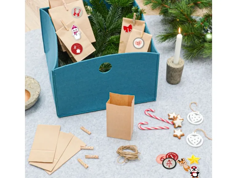 24 Papiertüten in 3 Größen, dazu Aufkleber, Klammern & 10 m Girlande zum Aufhängen.