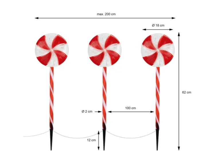 Mache dich bereit für die magische Weihnachtszeit mit unserer entzückenden Zuckerstangen-Weihnachtslichterkette. Diese zauberhafte Dekoration verbreitet Wärme und Freude und verwandelt deinen Garten in ein festliches Wunderland. Mit unserer LED Lolly Steckkette verwandelst du deinen Vorgarten, deinen Balkon oder einen Ort deiner Wahl in ein Winter Wunderland. Die Lichterkette besteht aus 3 Lollys und kann für Innen als auch Außen genutzt werden. Betrieben wird sie mit 3 AA Batterien betrieben. Danke dem wasserdichten Batteriekasten nach IP44 kannst du die Ketten auch draußen einstecken. Jede der 3 einzelnen Zuckerstangen-Lichter misst 62 cm x 18 cm. Zwischen jeder Zuckerstange befindet sich 100 cm. Die klassischen rot-weißen Zuckerstangenmuster dieser Lichterkette fangen den Geist der Feiertage perfekt ein. Sie sind nicht nur eine festliche Dekoration, sondern auch ein Symbol für die Freude und die Süßigkeiten, die Weihnachten mit sich bringt. Die Zuckerstangen-Weihnachtslichterkette ist nicht nur eine Dekoration, sondern ein Ausdruck deiner Liebe zur Weihnachtszeit. Sie wird deinen Garten in ein warmes, einladendes und festliches Ambiente tauchen. Keine lästigen Kabel oder Steckdosen notwendig. Unsere Zuckerstangen-Lichterkette wird mit 3 AA-Batterien betrieben, was sie unglaublich flexibel in der Platzierung macht. Du kannst sie überall setzen, wo du festlichen Glanz wünschst. Bestelle unsere Zuckerstangen-Lichterkette und lass sie den Zauber der Weihnacht in dein Zuhause bringen. Mach dich bereit für funkelnde Festtage und zauberhafte Erinnerungen. Funktionen, die dich begeistern werden: Strahlend: Funkelnde Zuckerstangen für festliche Stimmung. Robust: Langlebige Qualität für langanhaltende Freude. Funkelnd: Zauberhaftes Lichtspiel für festliche Atmosphäre. Kreativ: Vielseitig einsetzbar für individuelle Dekorationen. Bequem: Praktischer Timer für mühelosen Betrieb.