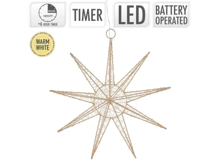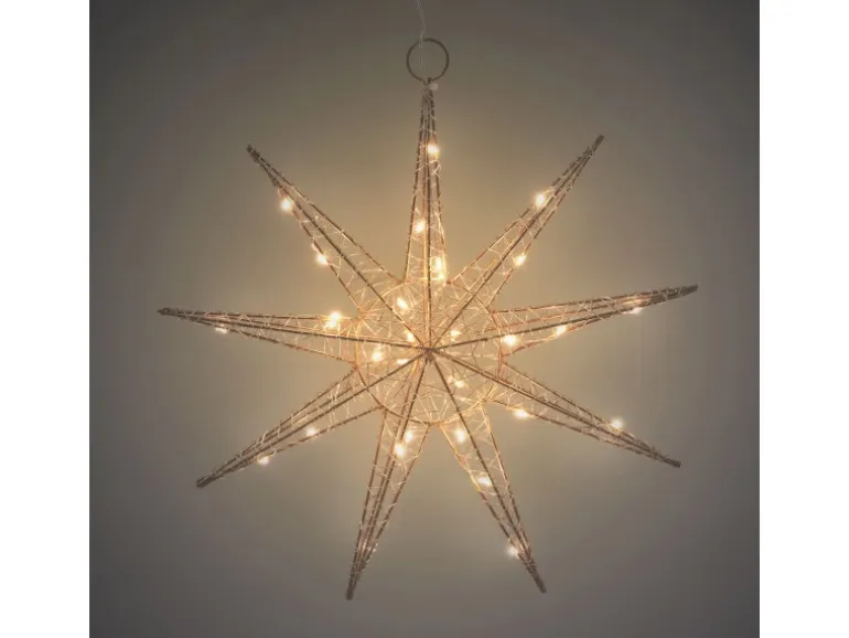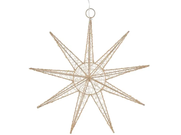 Das goldene Metallgestell, kunstvoll umwickelt mit filigranem Draht, verleiht diesem Weihnachtsstern eine edle Erscheinung, die alle Blicke auf sich zieht. Doch das wahre Highlight ist die warmweiße LED-Lichterkette, die den Stern sanft zum Leben erweckt. Die festliche Beleuchtung erzeugt eine märchenhafte Atmosphäre in deinem Zuhause und verbreitet festliche Freude.