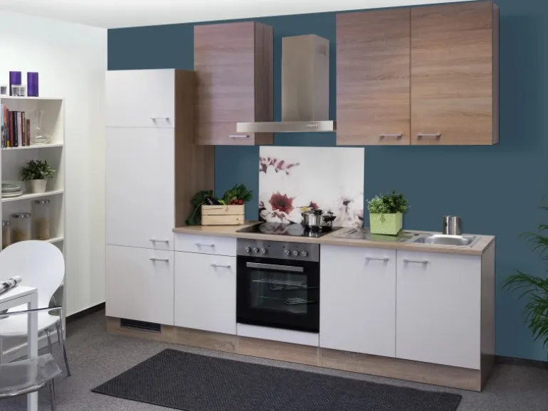 Die 270 cm breite Küchenzeile besteht aus (BxHxT):