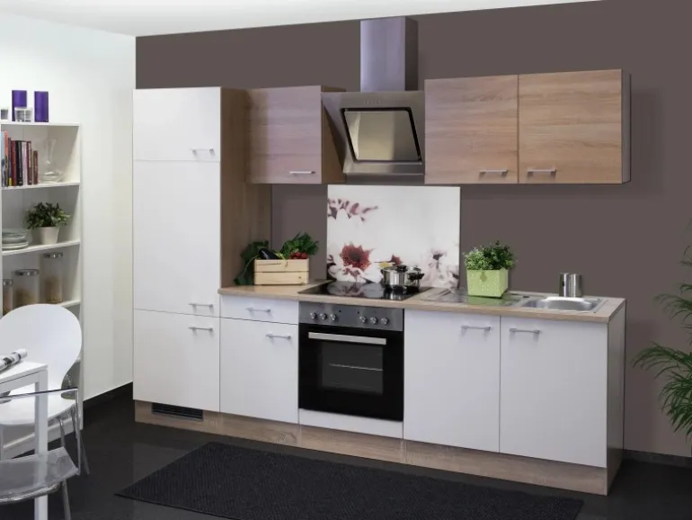 Die 270 cm breite Küchenzeile besteht aus (BxHxT):