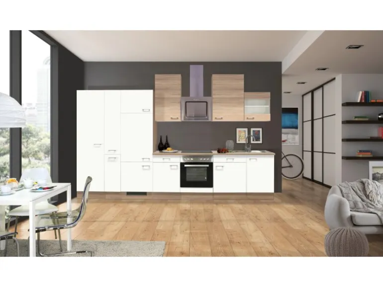 Diese moderne Küche mit einer Gesamtbreite von 360 cm ist ideal für Familien und ambitionierte Hobbyköche und bietet neben der hohen Funktionalität viel Stauraum für Geräte und Vorräte. Die Türen der Schränke sind sowohl für den links- als auch rechtsseitigen Aufbau vorbereitet, was Ihnen ein Höchstmaß an Flexibilität bei der Montage bietet. Die 140 cm breite Einheit aus Geschirr-, Apotheker- und Geräteschrank inkl. Kühlschrank lässt sich individuell stellen und passt sich so den unterschiedlichen räumlichen Gegebenheiten perfekt an. Die hochwertigen und pflegeleichten Kunststofffronten und die stabile Bauweise der Schrankkörper garantieren Ihnen lange Freude an Ihrer Küche. Eine Arbeitsplatte im passenden Design gehört bei unseren Küchenzeilen natürlich immer dazu. Eine gut verständliche Aufbauanleitung sowie sämtliche Beschläge liegen selbstverständlich dabei.